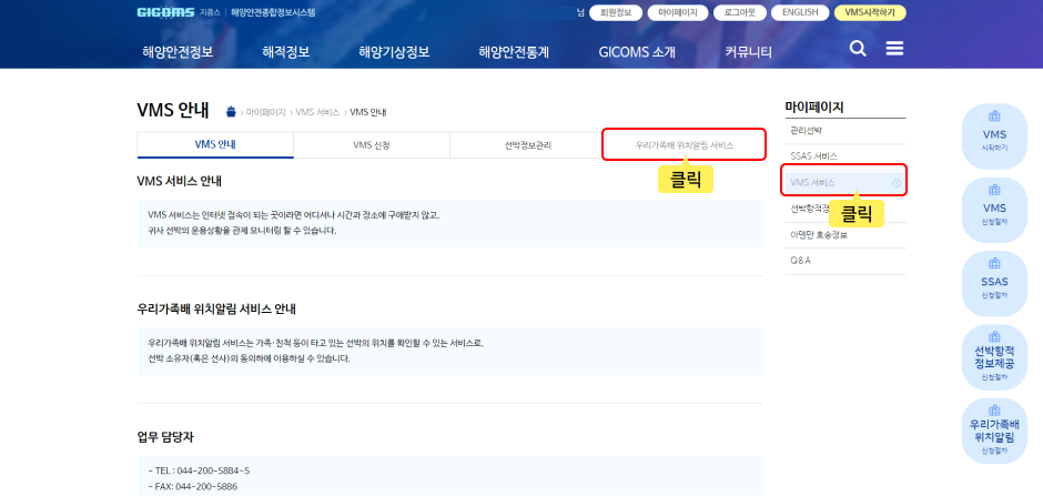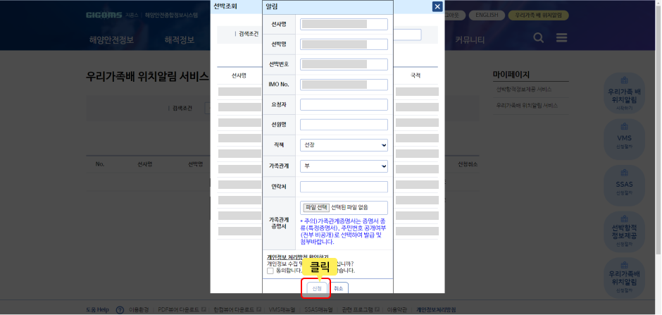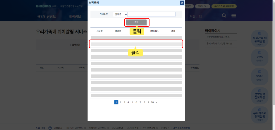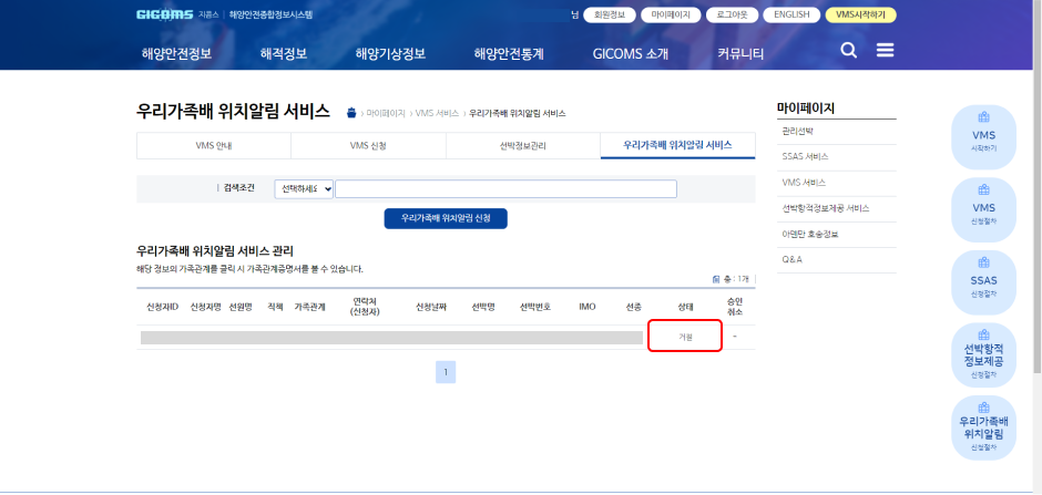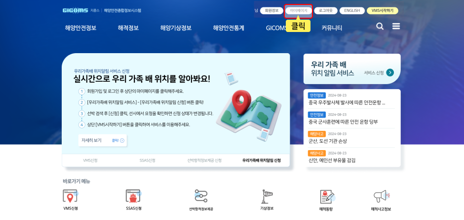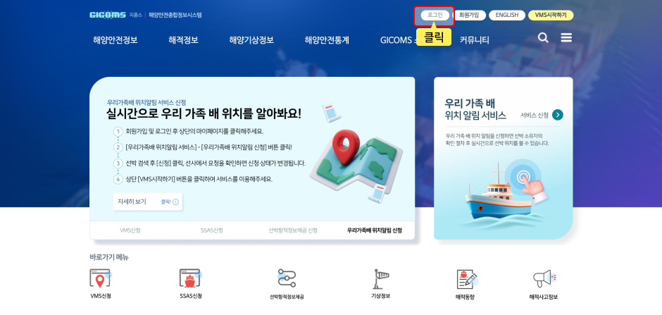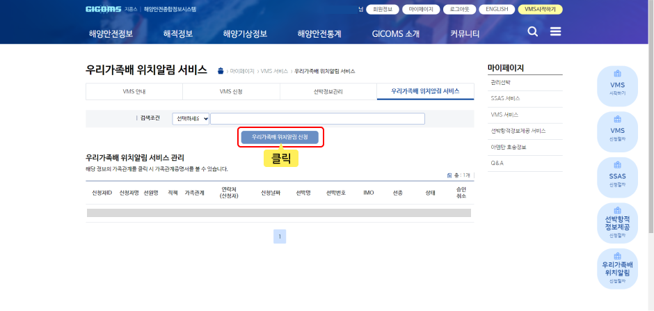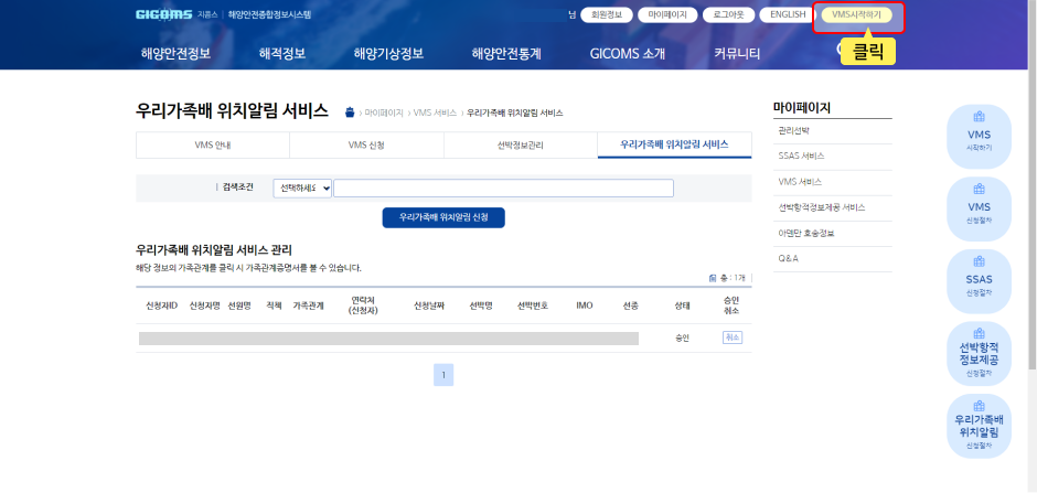 01. 먼저 로그인을 해주세요. - 우리가족배 위치알림을 신청하기 위해서 회원가입이 되어있어야 합니다. - 우측 상단의 버튼을 통해 회원가입 후 로그인해주세요. 02. 메인화면의 [마이페이지]버튼을 클릭해주세요. 03. [우리가족배 위치알림 서비스] 탭을 클릭해주세요. - 마이페이지 우측 메뉴에서 [VMS 서비스] - [우리가족배 위치알림 서비스] 탭을 클릭합니다. 04. [우리가족배 위치알림 신청] 버튼을 클릭합니다. 05. 선박 정보를 조회하신 후 선박을 선택해주세요. - 선박을 검색해주세요. - 조회 결과 리스트에서 선박을 선택해주세요. 06. 요청자 정보 작성 후 [신청] 버튼을 클릭해주세요. - 선박 정보를 확인 후 요청자 정보를 작성하고 [신청] 버튼을 클릭해주세요. 07. 신청 정보를 확인해주세요. - 신청 후에는 신청상태가 [승인대기중]으로 변경됩니다. 08. 선사에서 요청을 확인하면 신청상태가 변경됩니다. - 선사에서 요청을 승인하면 신청상태가 [승인]으로 변경됩니다. - 선사에서 요청을 거절하면 신청상태가 [거절]로 변경됩니다. 09. 상단 [VMS시작하기] 버튼을 클릭하여 서비스를 이용해주세요. - 또는 우측 VMS시작하기 버튼을 클릭하여 서비스를 이용하실 수 있습니다. 이전 다음